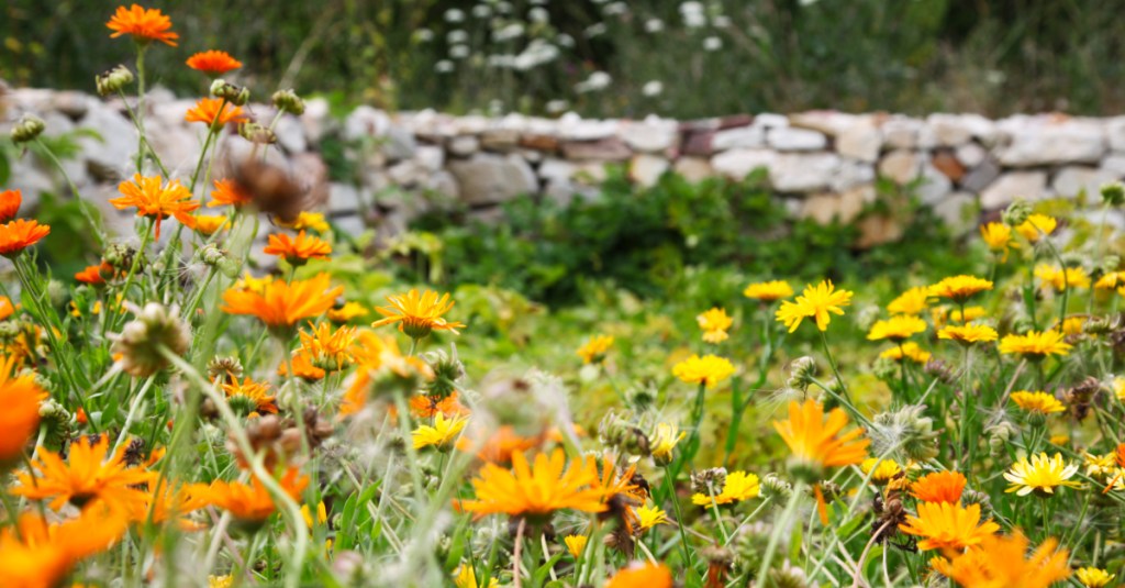 Ringelblume leuchtet vor Natursteinmauer